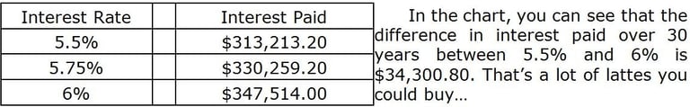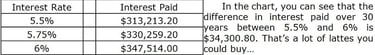 The interest rate: this is the cost of borrowing the money. If your chosen rate is 6%, then you can think of it as, ‘it costs me 6% to "use" that loaned money’. The interest rate can make a huge difference on the cost associated with keeping a mortgage for a long period of time. To demonstrate, let's compare the amount of interest paid for a $300,000 loan with a 5.5%, 5.75% and 6% interest rate with a 30 year term.