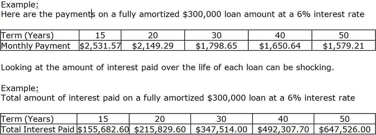 The term: how long is the time period for repayment? There are 7, 10, 15, 20, 30, 40 and 50 year terms available. A loan with a 30 year term that is fully amortized* will be paid off in 30 years.